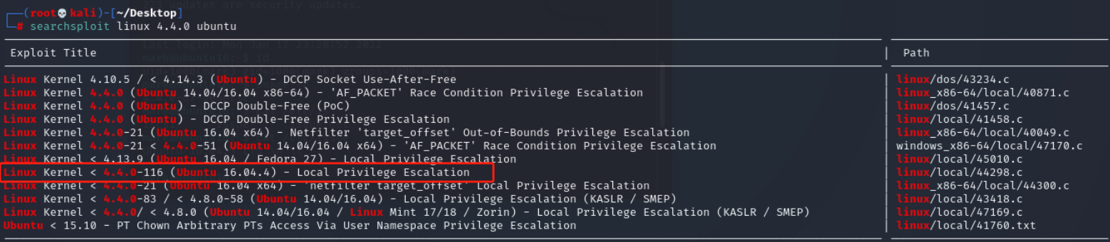 确定目标服务器内核版本和系统版本后,通过kali下的searchploit来搜索相关EXP