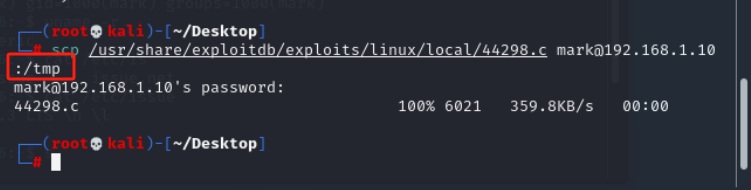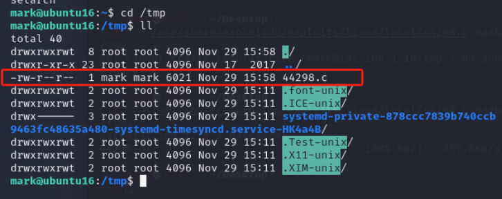 注意传输路径为/tmp,因为所有用户都对tmp目录有读写权限,此时目标主机已经有有了exp文件