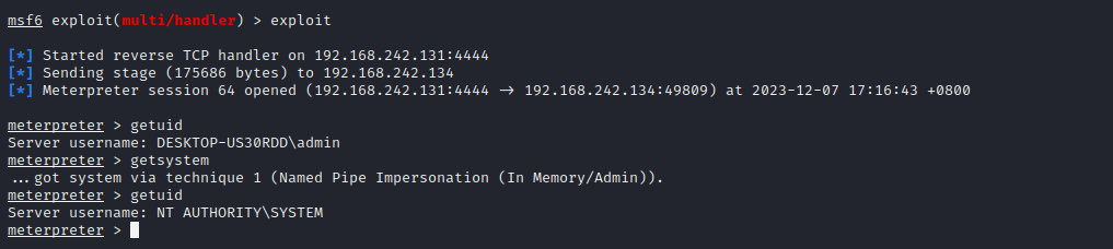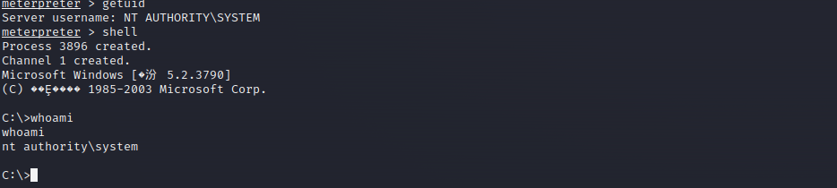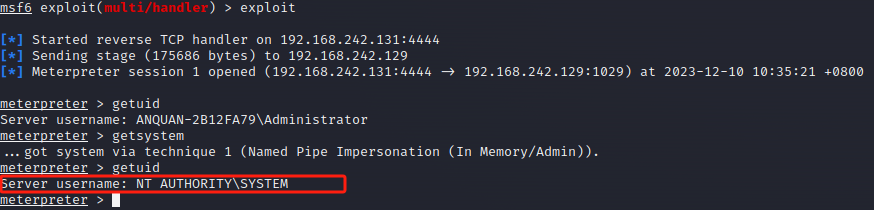当目标是Windows server 2003,管理员用户运行木马时,直接使用getsystem提权