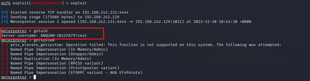 当这里目标机器为win10 ,管理员用户运行,直接使用getsystem提权失败