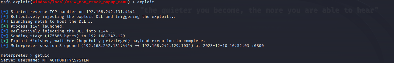 对里面的提示的漏洞逐一利用,win10里面打了一些补丁,这里面都没有提权成功