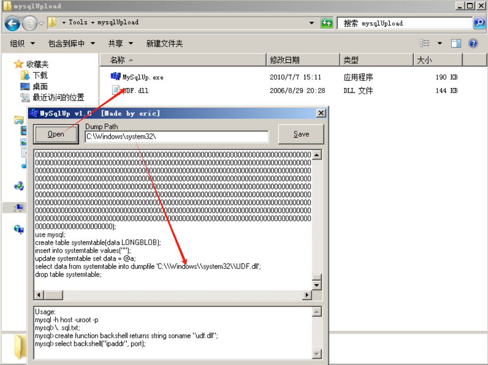 如果我们拥有对 mysql库的创建和删除权限的话,就可以首先上传提供渗透攻击功能的UDF.DLL 文件,然后在 MySQL 中创建自定义的函数,功能来源于上一步上传的 UDF.DLI文件;最后调用上一步中创建的自定义函数,实现渗透攻击。