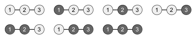 顶点染色的方案共有 7 种。在这些方案中,顶点 1 为黑色的有 3 种,顶点 2 为黑色的有 4 种,顶点 3 为黑色的有 3 种。