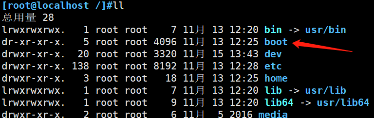 ①d ②r-xr-xr-x. ③5 ④root ⑤root ⑥4096 ⑦11月 13 12:25 ⑧boot