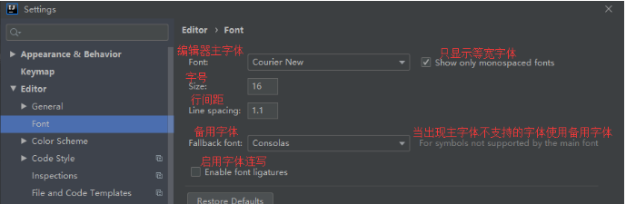 设置在:"Editor"的"Font"中,分别设置编辑器字体、字号、行间距