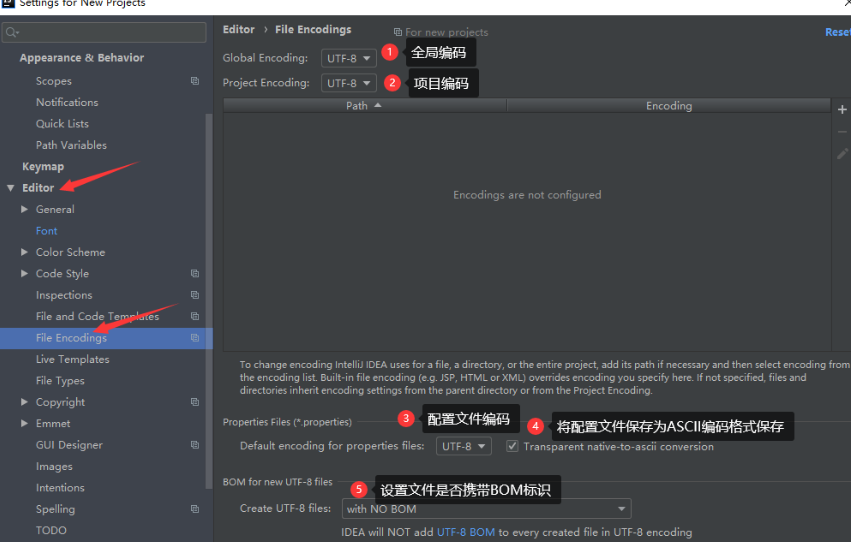 设置在:“File | Settings | Editor | File Encodings“