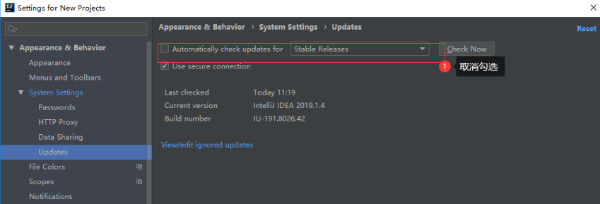 “File | Settings | Appearance & Behavior | System Settings | Updates”