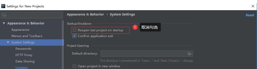 七、关闭自动更新设置以及每次打开项目为最后关闭项目