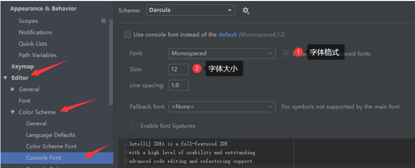 控制台字体和编辑器字体设置一个逻辑,设置在:"Editor"下"Color Scheme"的"Console Font"里。