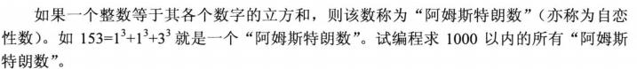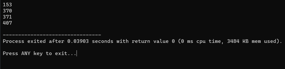 #include<bits/stdc++.h> int main() { int n,a[3],i,m=0; for(n=2;n<1000;n++) { int k=n;m=0; for( i=0;k;i++) { a[i]=k%10; k/=10; } for(;i>=0;i--) { m+=pow(a[i],3); } if(n==m) { printf("%d\n",n); } } return 0; }