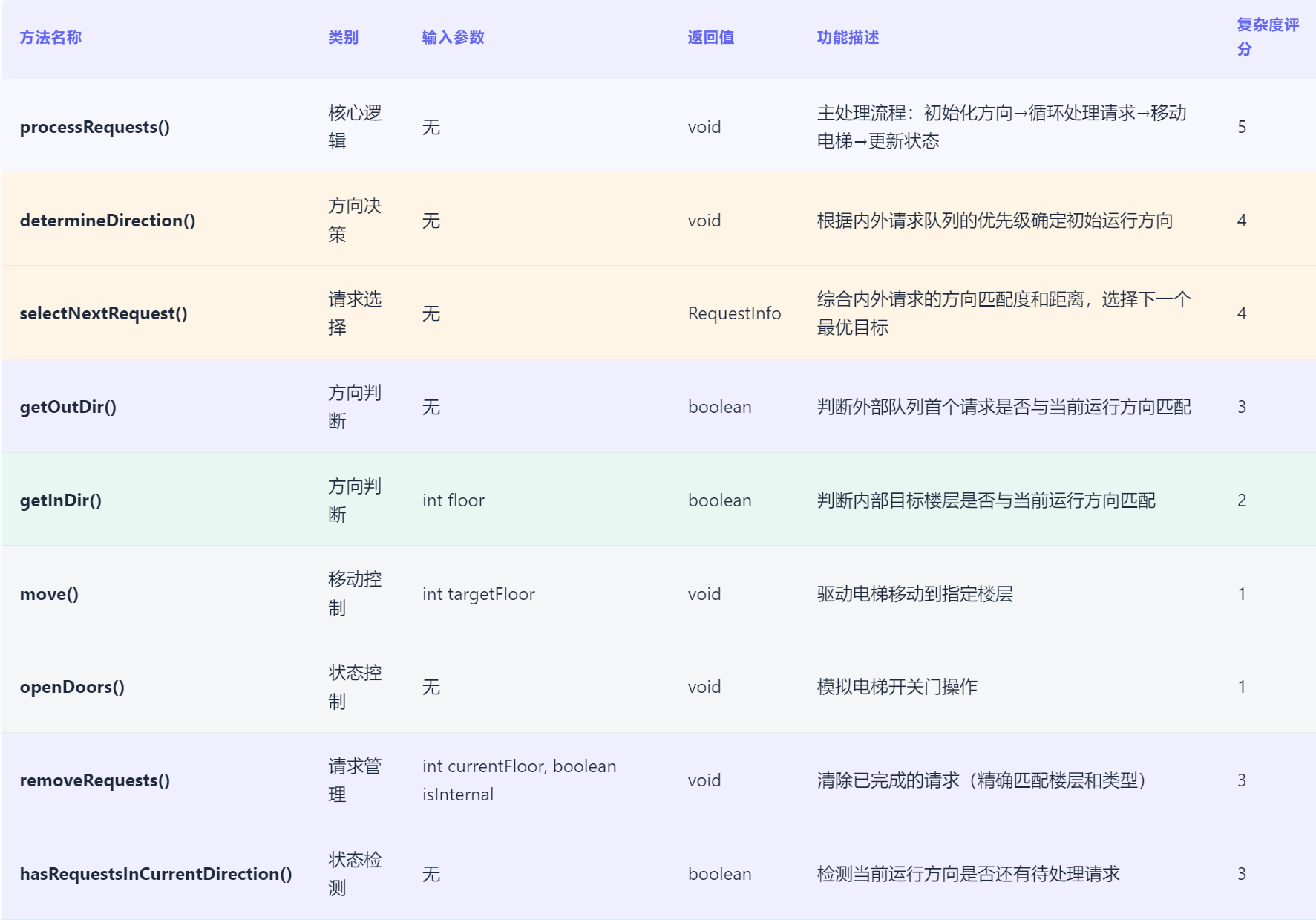 在 代码中,部分方法如 ControlSystem.decideProcessingOrder() 存在逻辑嵌套和复杂判断。我们可以进一步将相关逻辑模块化,例如将方向匹配的判断逻辑拆分到独立的小方法中,以提高代码可读性。同时,通过抽象通用接口或父类,隐藏具体实现细节,降低代码耦合度和复杂度,使代码更易于理解和维护。 - 增强调度算法的智能性