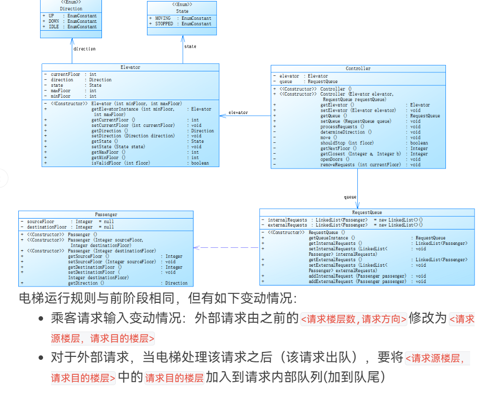 - 算法改进:为实现新功能采用了更高效、简洁的算法。比如在决定电梯请求处理顺序时,新代码可能摒弃了之前复杂的多重嵌套判断,改用更合理的逻辑判断方式。像 ControlSystem.decideProcessingOrder() 方法,通过合理分析内外部请求与电梯当前方向的关系,避免了过多冗余的判断层次,减少了代码的复杂度。