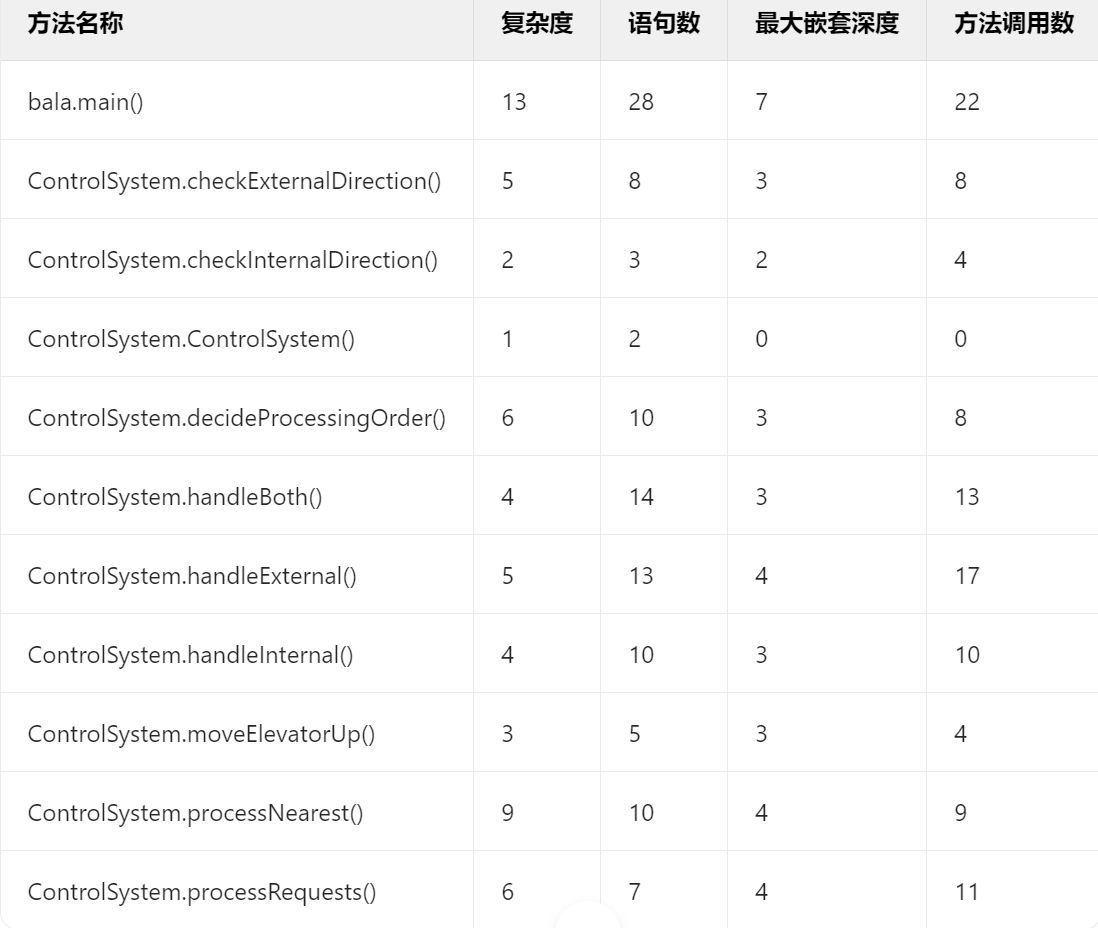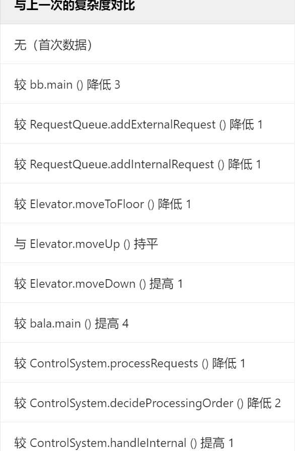 - 逻辑拆分:在增加功能的过程中,对原有的复杂代码进行了重构。例如,把一个承担多种功能、逻辑高度耦合的大方法,拆分成了多个功能单一的小方法。就像之前可能 Elevator.processRequests() 方法把电梯运行的各种逻辑都糅合在一起,复杂度很高。但在新代码中,将请求处理逻辑按照不同阶段或类型,分别放到 ControlSystem 类的 handleInternal()、handleExternal() 等方法中,每个方法专注于一件事,使得代码逻辑更加清晰,复杂度自然就降低了。