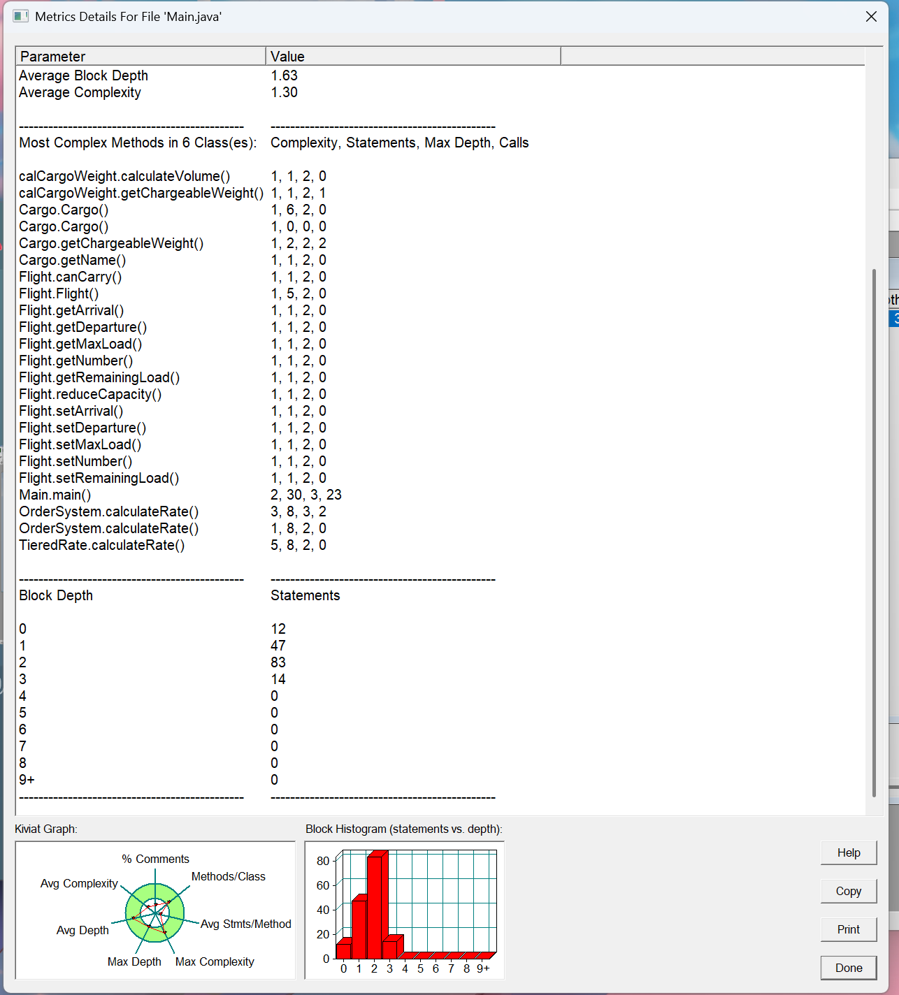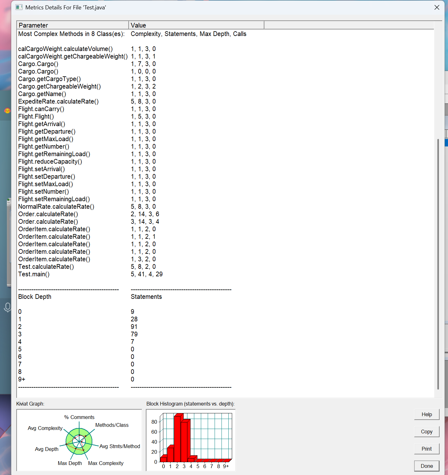 - 复杂度分布特征图中显示复杂度峰值为5级,出现在main方法和费率计算方法