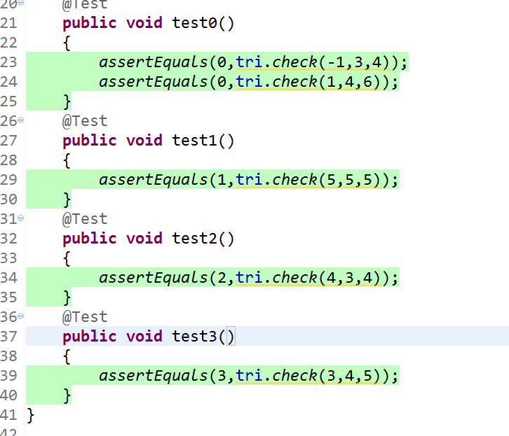 package cn.tju.scs; import static org.junit.Assert.assertEquals; import java.util.Arrays; import java.util.Collection; import java.util.List; import org.junit.Before; import org.junit.Test; import org.junit.Test; import org.junit.runner.RunWith; import org.junit.runners.Parameterized; import org.junit.runners.Parameterized.Parameters; public class testTriangle { public triangle tri; @Before public void setUp() { tri=new triangle(); } @Test public void test0() { assertEquals(0,tri.check(-1,3,4)); assertEquals(0,tri.check(1,4,6)); } @Test public void test1() { assertEquals(1,tri.check(5,5,5)); } @Test public void test2() { assertEquals(2,tri.check(4,3,4)); } @Test public void test3() { assertEquals(3,tri.check(3,4,5)); } }