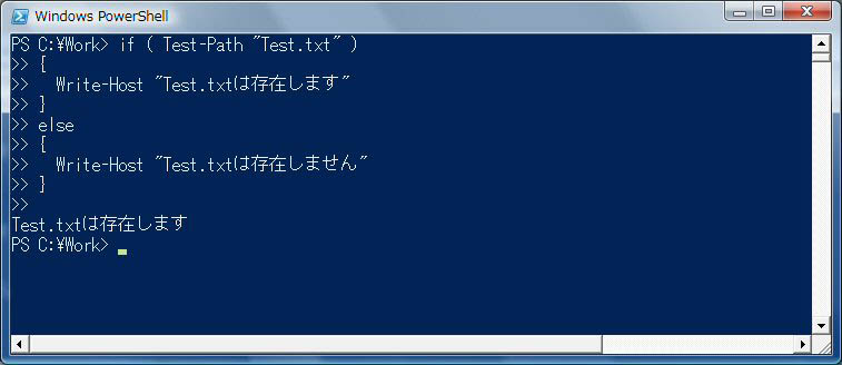 PS C:\Work> if ( Test-Path "Test.txt" ) >> { >> Write-Host "Test.txtは存在します" >> } >> else >> { >> Write-Host "Test.txtは存在しません" >> } >>