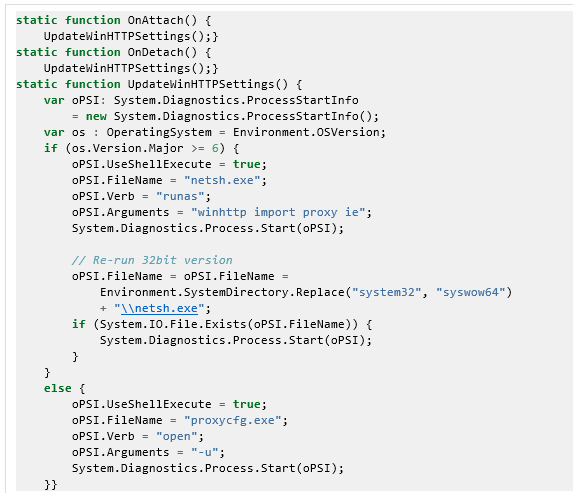 注:UpdateWinHTTPSettings函数里做的事情其实很简单,就是使用管理员权限执行文章前面说到的命令