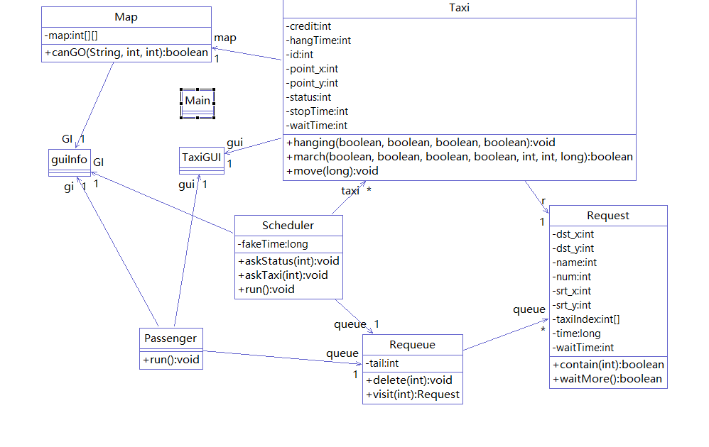 出租车作业相对而言,没有前面的两次作业难,实现起来也并不是很难,100辆出租车霉200ms改变一次位置,乘客请求发出之后,记录满足抢单要求的出租车编号,抢单窗口结束之后选择符合条件地出租车。然后就是关于如何确定行车路线的问题,由于在gui包里面就已经有了单点bfs的遍历,所以在行驶至某一点时,分别计算出周围四个点距离终点的距离,选择最短的一个方向行驶就可以,不过这样就带来了一个问题,由于单点bfs的遍历时间太长,所以做不到每次比较都允许四次bfs的遍历,预处理又会留下很长的真空期,所以我们考虑好好利用抢单窗口的3000ms,这里足以计算出我们需要的数据,所以我在这里又开了一个线程来计算。因为我是100个出租车就一个线程,所以线程安全并不是那么难考虑,相当于一个消费者,一个生产者,共享对象就是用于储存请求的队列。