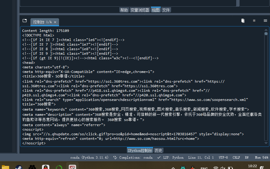 url = 'https://www.so.com/' for i in range(20): response = requests.get(url) print(f"第{i+1}次访问") print(f'Response status: {response.status_code}') print(f'Text content length: {len(response.text)}') print(f'Content length: {len(response.content)}') print(response.text)