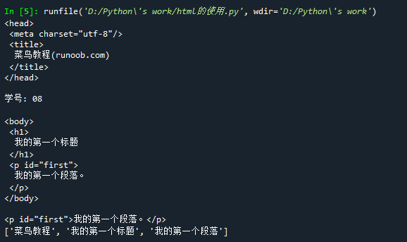 from bs4 import BeautifulSoup import re text = """ <!DOCTYPE html> <html> <head> <meta charset="utf-8"> <title>菜鸟教程(runoob.com)</title> </head> <body> <h1>我的第一个标题</h1> <p id="first">我的第一个段落。</p> </body> <table border="1"> <tr> <td>row 1, cell 1</td> <td>row 1, cell 2</td> </tr> <tr> <td>row 2, cell 1</td> <td>row 2, cell 2</td> </tr> </table> </html> """ # 创建BeautifulSoup对象 soup = BeautifulSoup(text, features="html.parser") # 打印head标签和学号后两位 print(soup.head.prettify()) print("学号: 08\n") # 获取body标签对象 print(soup.body.prettify()) # 获取id为first的对象 first_p = soup.find(id="first") print(first_p) # 获取打印中文字符 pattern = re.compile(u'[\u4e00-\u9fff]+') chinese_chars = pattern.findall(text) print(chinese_chars)