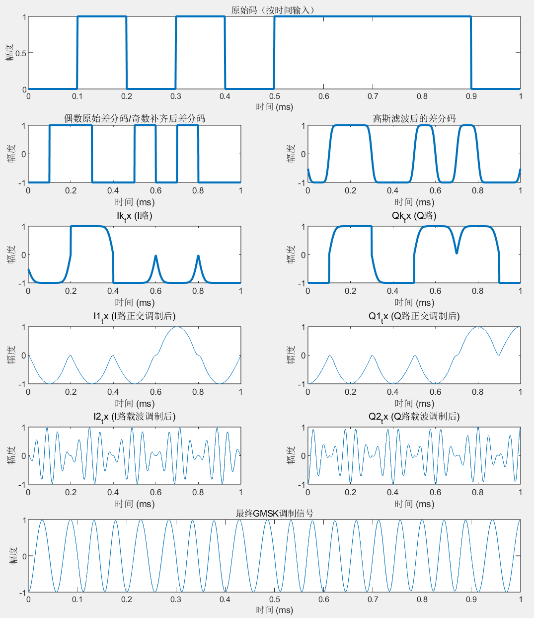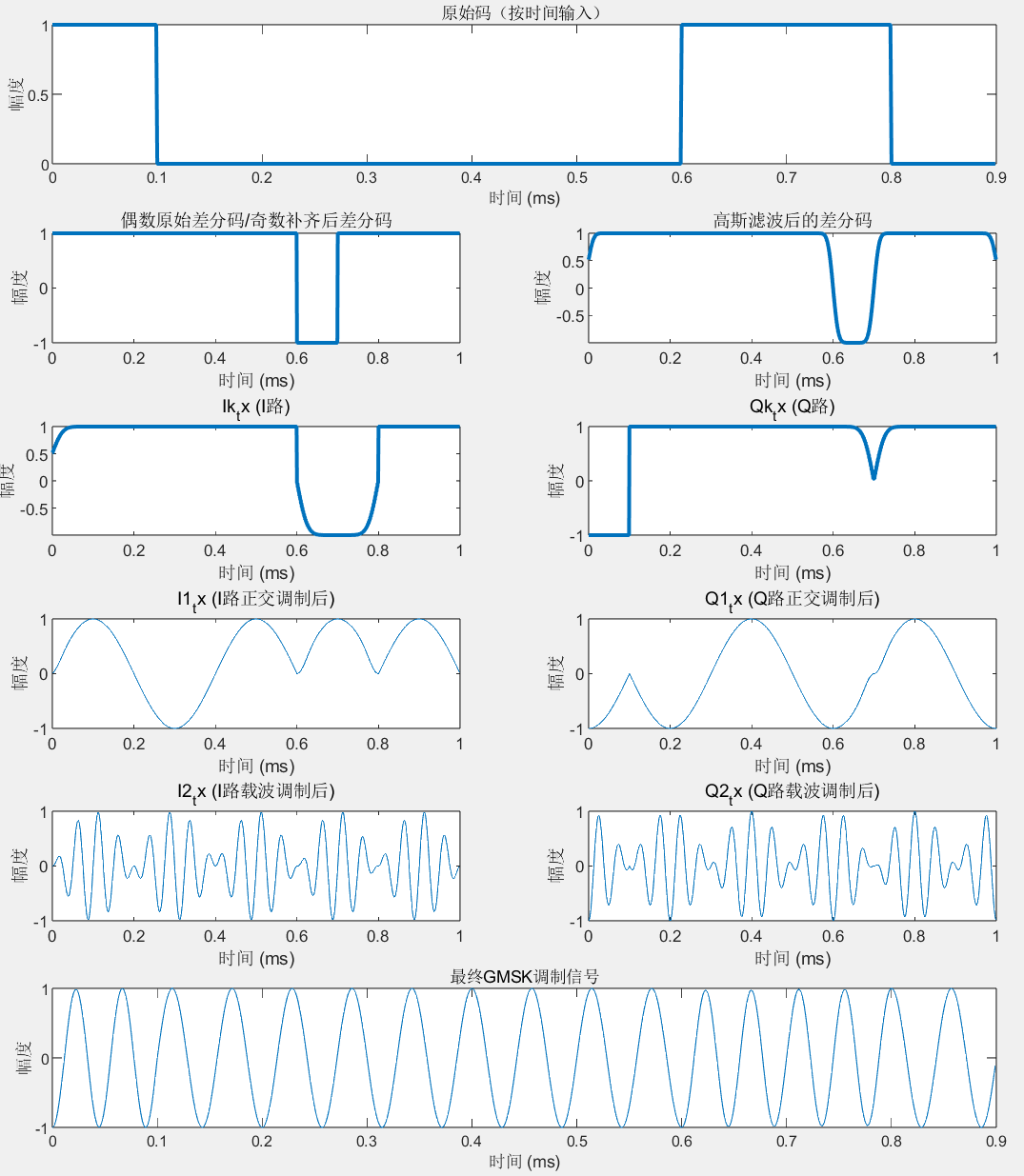 高斯滤波后面的串并转换及扩展码元和奇偶序列的处理在本章问题1、2中介绍。正交调制和载波调制以及信号相加合成较为简单,语法上相乘相加即可。