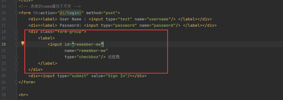 (2)在前端的自定义login.html 表单里添加“记住我”的单选框标签 ,name属性不可更改