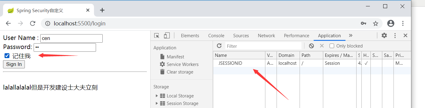 <!DOCTYPE html> <html xmlns="http://www.w3.org/1999/xhtml" xmlns:th="http://www.thymeleaf.org" xmlns:sec="http://www.thymeleaf.org/thymeleaf-extras-springsecurity3"> <head> <title>Spring Security自定义</title> </head> <body> <div th:if="${param.error}"> Invalid username and password. </div> <div th:if="${param.logout}"> You have been logged out. </div> <!-- 表单的name属性不可变 --> <form th:action="@{/login}" method="post"> <div><label> User Name : <input type="text" name="username"/> </label></div> <div><label> Password: <input type="password" name="password"/> </label></div> <div class="form-group"> <label> <input id="remember-me" name="remember-me" type="checkbox"/> 记住我 </label> </div> <div><input type="submit" value="Sign In"/></div> </form> <hr> <br> lalallalalal但是开发建设士大夫立刻 </body> </html>