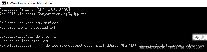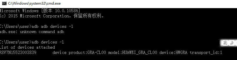 将手机用数据线连接到电脑,并授权USB调试模式。查看连接的效果,在cmd下运行命令:adb devices -l 查看UDID,如下图