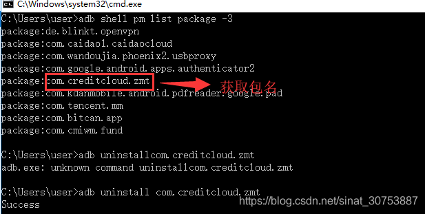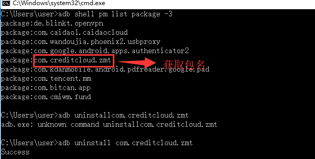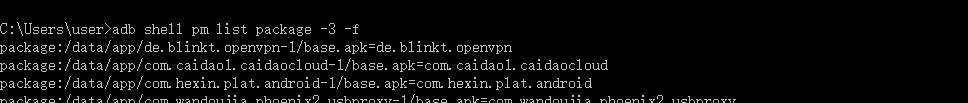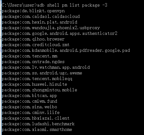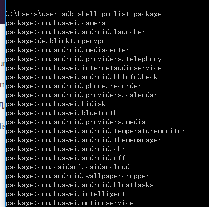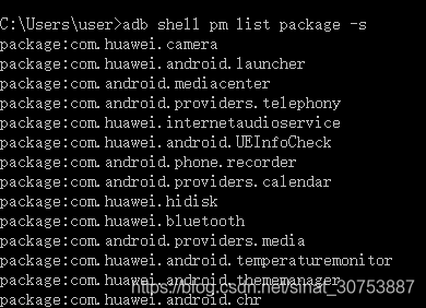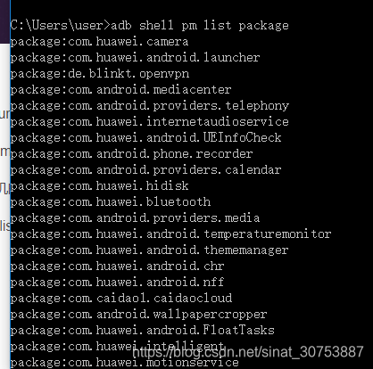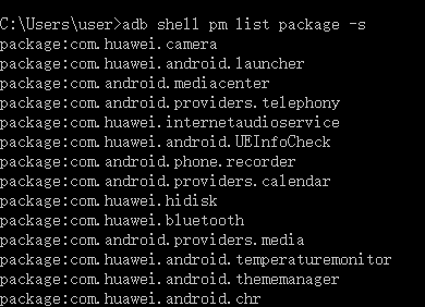 通过此adb shell pm list package语句可以查看以列表的方式显示所有的包名,如下图: