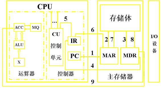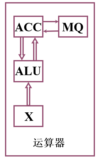 假设ACC存有前一刻数据,然后得到另一个数据X,与ACC通过ALU中的运算,最后得到结果,然后保留进ACC中。如果是乘,则高位保留入ACC,低位在MQ中,如果是除,商暂留在MQ中,余数保留在ACC中。