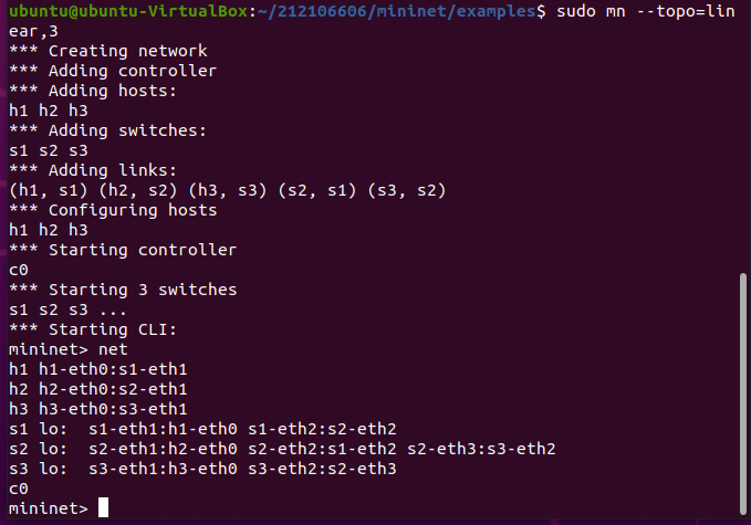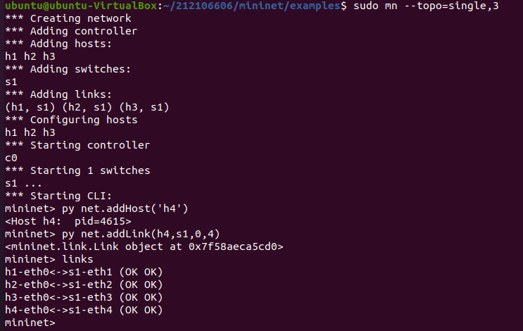 在2 b)的基础上,在Mininet交互界面上新增1台主机并且连接到交换机上,再测试新拓扑的连通性。