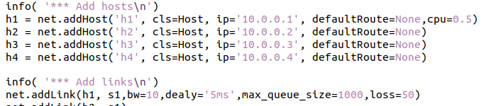 b) h1和s1之间的链路带宽为10,延迟为5ms,最大队列大小为1000,损耗率50。