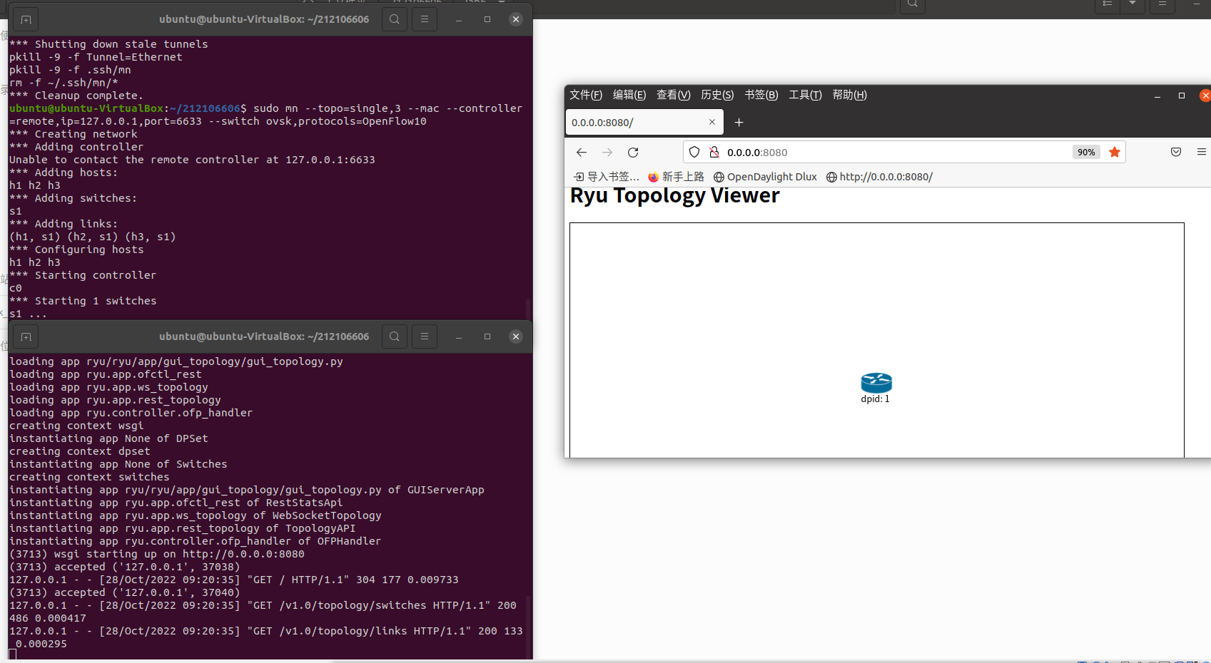 搭建下图所示SDN拓扑,协议使用Open Flow 1.0,并连接Ryu控制器,通过Ryu的图形界面查看网络拓扑。
