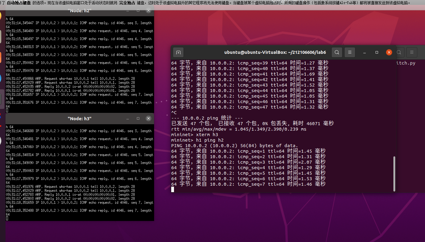 阅读Ryu文档的The First Application一节,运行当中的L2Switch,h1 ping h2或h3,在目标主机使用 tcpdump 验证L2Switch,分析L2Switch和POX的Hub模块有何不同。