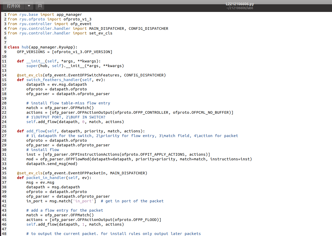 - 能够理解RYU控制器实现软件定义的集线器原理;