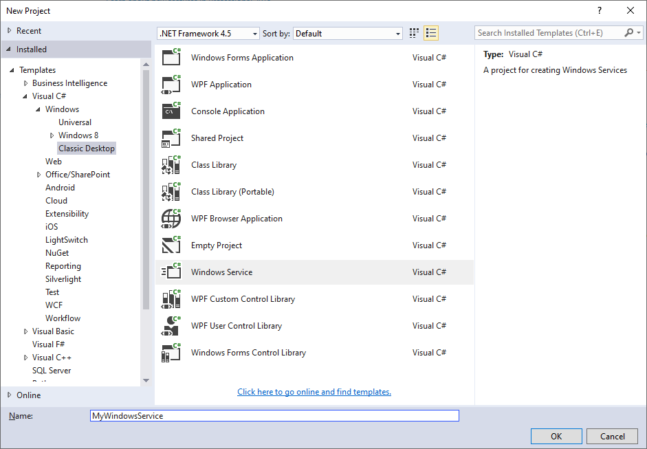 1、新建一个Windows Service,并将项目名称改为"MyWindowsService":