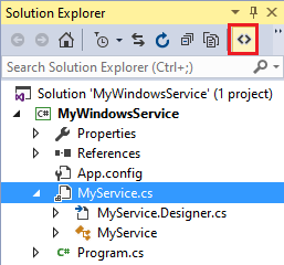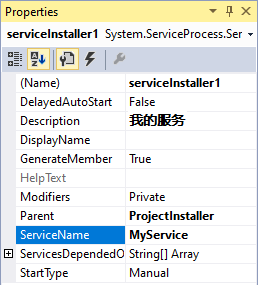 6、点击"serviceInstaller1",在"属性"窗体将ServiceName改为MyService,Description改为我的服务