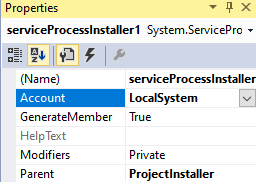 7、点击"serviceProcessInstaller1",在"属性"窗体将Account改为LocalSystem