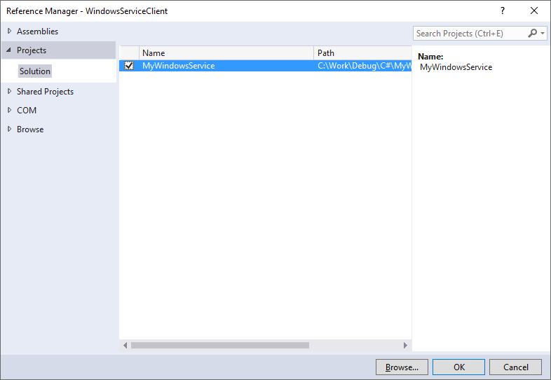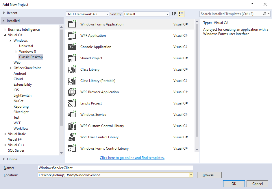 1、在同一解决方案中新建一个Windows Form项目,命名为WindowsServiceClient
