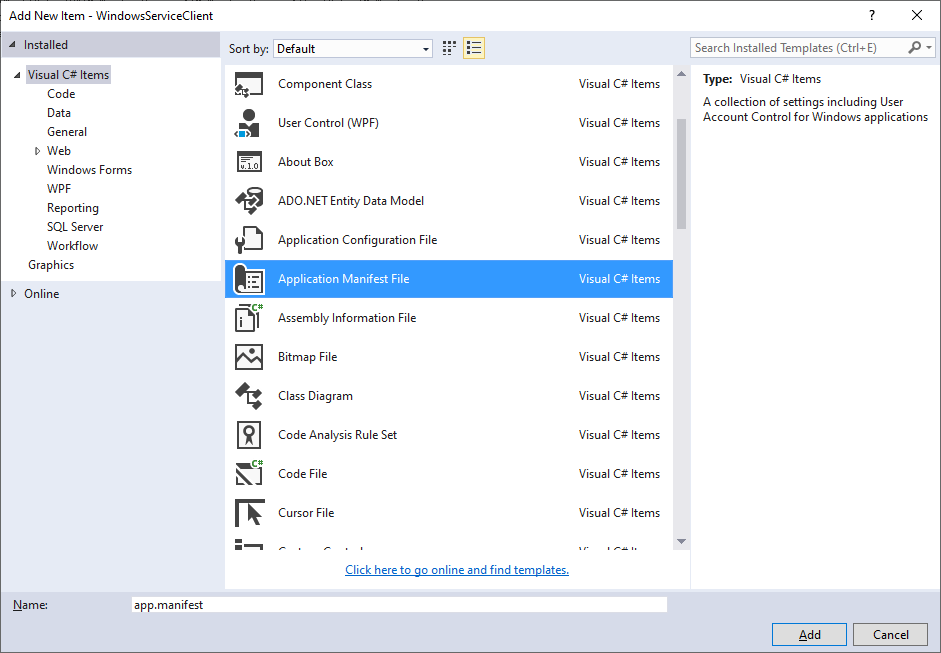 6、由于需要安装服务,故需要使用UAC中Administrator的权限,在项目“WindowsServiceClient”添加“Application Manifest File”并单击确定