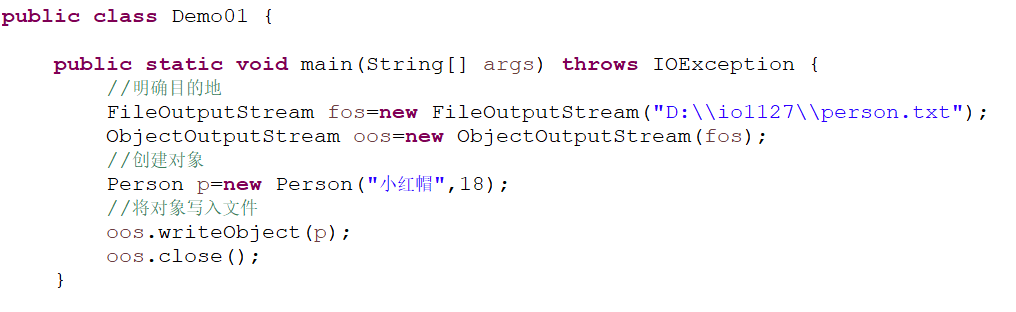 得到当这个具有序列化接口时不抛出这个异常,所有我们要序列化的对象需要实现序列化接口serializable,实现之后我们将这个对象写入文件中去得到如下代码