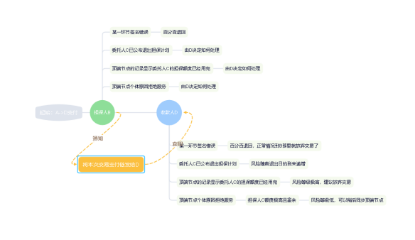 收款人D在A的支付过程中起监察作用,在“仲裁机制实现规避双重支付”章节详解。收款人认为支付条件不可信时可以发起放弃收款来失效本次交易。放弃本次交易的签名指令将会首先发给A的开户方C,然后由C负责同步到顶级节点,解除占用本次交易的担保额度。