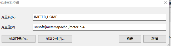 系统变量下新建——输入变量名称“JMETER_HOME”,变量名称就是JMeter安装路径