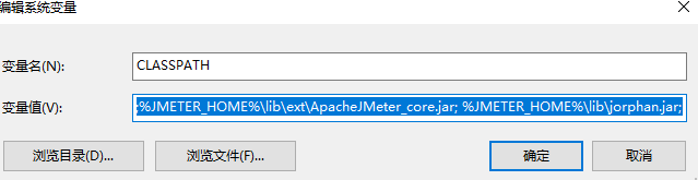 找到CLASSPATH变量——编辑,在变量值中加入:%JMETER_HOME%\lib\ext\ApacheJMeter_core.jar; %JMETER_HOME%\lib\jorphan.jar;