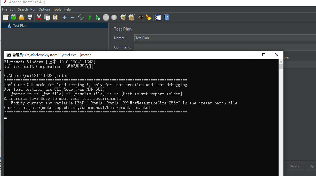 打开cmd面板,输入jmeter回车,可以看到jmeter成功启动,此cmd窗口关闭jmeter也会随之关闭(最小化到任务栏即可)