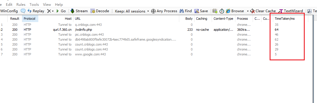二、访问接口,Fiddler查看Time Taken(响应时间)