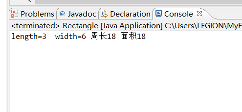 package Test; public class Rectangle { int length; int width; public int getArea(int length,int width){ return length*width; } public int getPer(int length,int width){ return (length+width)*2; } public void showAll(){ System.out.println("length=" + length + " "+" width=" + width + " "+"周长"+(length+width)*2+" "+"面积"+length*width); } public Rectangle(int length,int width){ this.length =length; this.width =width; } public static void main(String[] args) { Rectangle a=new Rectangle(3,6); a.showAll(); } }