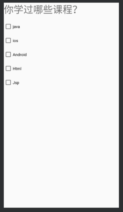 <?xml version="1.0" encoding="utf-8"?> <LinearLayout xmlns:android="http://schemas.android.com/apk/res/android" android:layout_width="match_parent" android:layout_height="match_parent" android:orientation="vertical"> <TextView android:layout_width="match_parent" android:layout_height="60dp" android:text="你学过哪些课程?" android:textSize="15pt"></TextView> <CheckBox android:layout_width="100dp" android:layout_height="50dp" android:text="java"/> <CheckBox android:layout_width="100dp" android:layout_height="50dp" android:text="ios" /> <CheckBox android:layout_width="100dp" android:layout_height="50dp" android:text="Android" /> <CheckBox android:layout_width="100dp" android:layout_height="50dp" android:text="Html" /> <CheckBox android:layout_width="100dp" android:layout_height="50dp" android:text="Jsp" /> </LinearLayout>