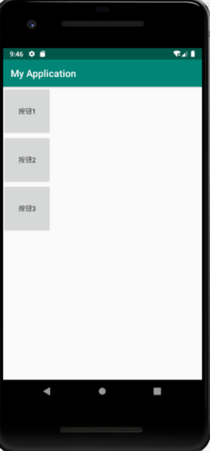 <?xml version="1.0" encoding="utf-8"?> <RelativeLayout xmlns:android="http://schemas.android.com/apk/res/android" xmlns:app="http://schemas.android.com/apk/res-auto" xmlns:tools="http://schemas.android.com/tools" android:layout_width="match_parent" android:layout_height="match_parent" tools:context=".Main5Activity"> <Button android:id="@+id/v1" android:layout_width="100dp" android:layout_height="100dp" android:text="按钮1" android:onClick="btnlmethod"/> <Button android:id="@+id/v2" android:layout_width="100dp" android:layout_height="100dp" android:layout_below="@id/v1" android:text="按钮2"/> <Button android:id="@+id/v3" android:layout_width="100dp" android:layout_height="100dp" android:layout_below="@id/v2" android:text="按钮3" /> </RelativeLayout>
